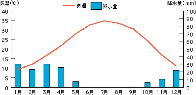 - 大部分は砂漠である。:暑く、乾燥し、雲もない夏と、温暖、涼しい冬。